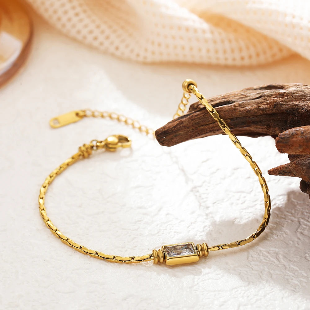 Add timeless elegance to your look with this adjustable bracelet, available in both 18K gold plating and silver finish. Featuring a delicate chain and a dazzling square-cut zircon centerpiece, this bracelet blends minimalism with sophistication.