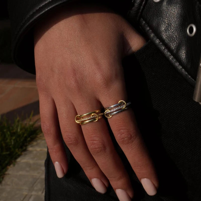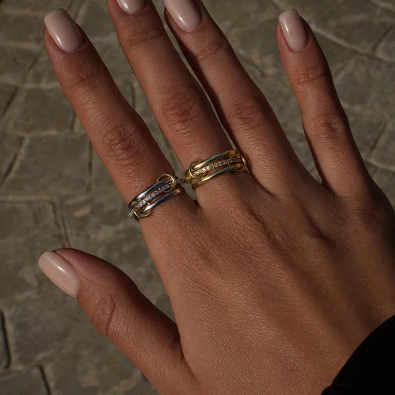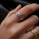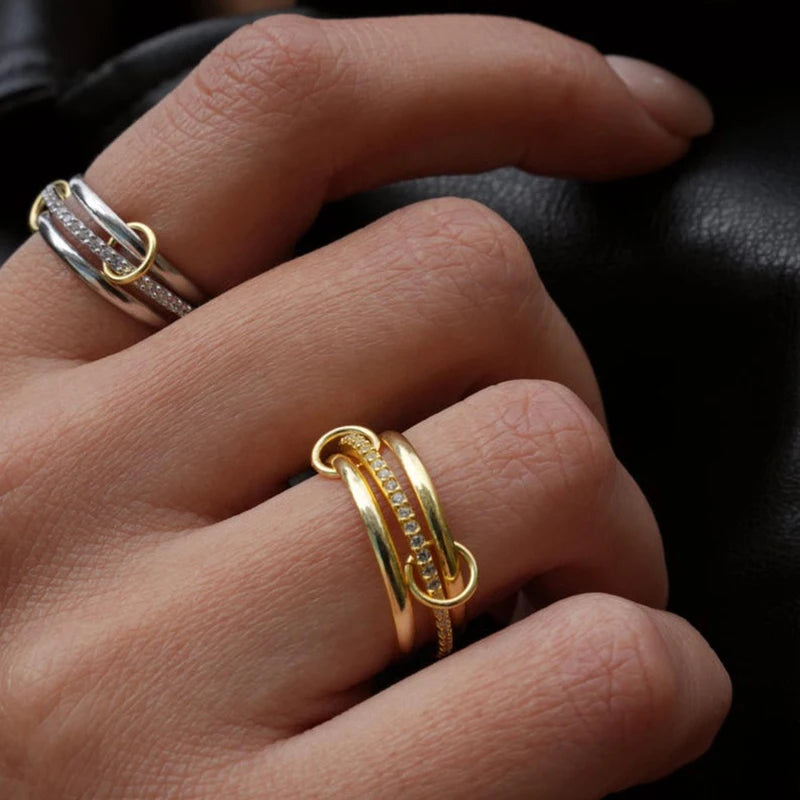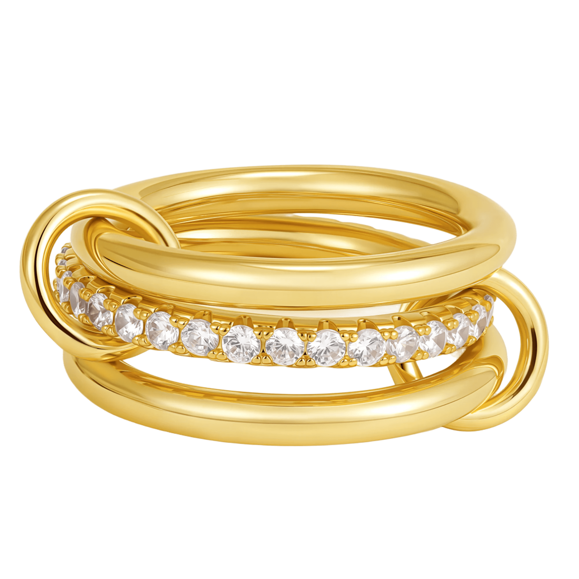 Add a touch of luxury to your style with our 18K Gold Plated Stacking Ring. Featuring multiple interlocking bands, including one adorned with sparkling CZ stones, this ring combines elegance with a modern twist. Perfect for stacking with other rings or wearing alone as a statement piece, it’s a versatile accessory that elevates any outfit.
