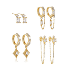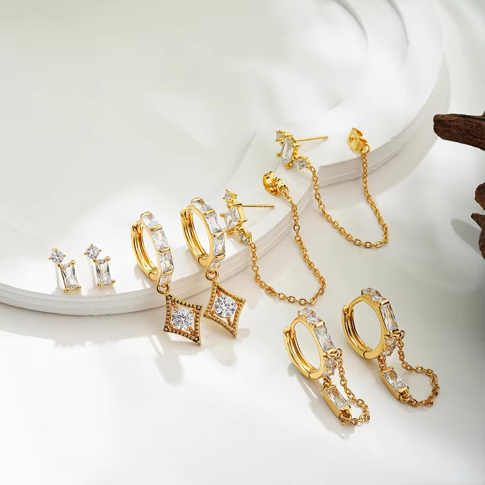 Add timeless elegance to your jewelry collection with this 18K gold plated earring set. Featuring 4 unique designs—sparkling studs, chic hoops, trendy chain earrings, and geometric dangles—this set offers the perfect combination of style and versatility. Each piece is adorned with brilliant cubic zirconia stones that catch the light beautifully.