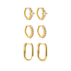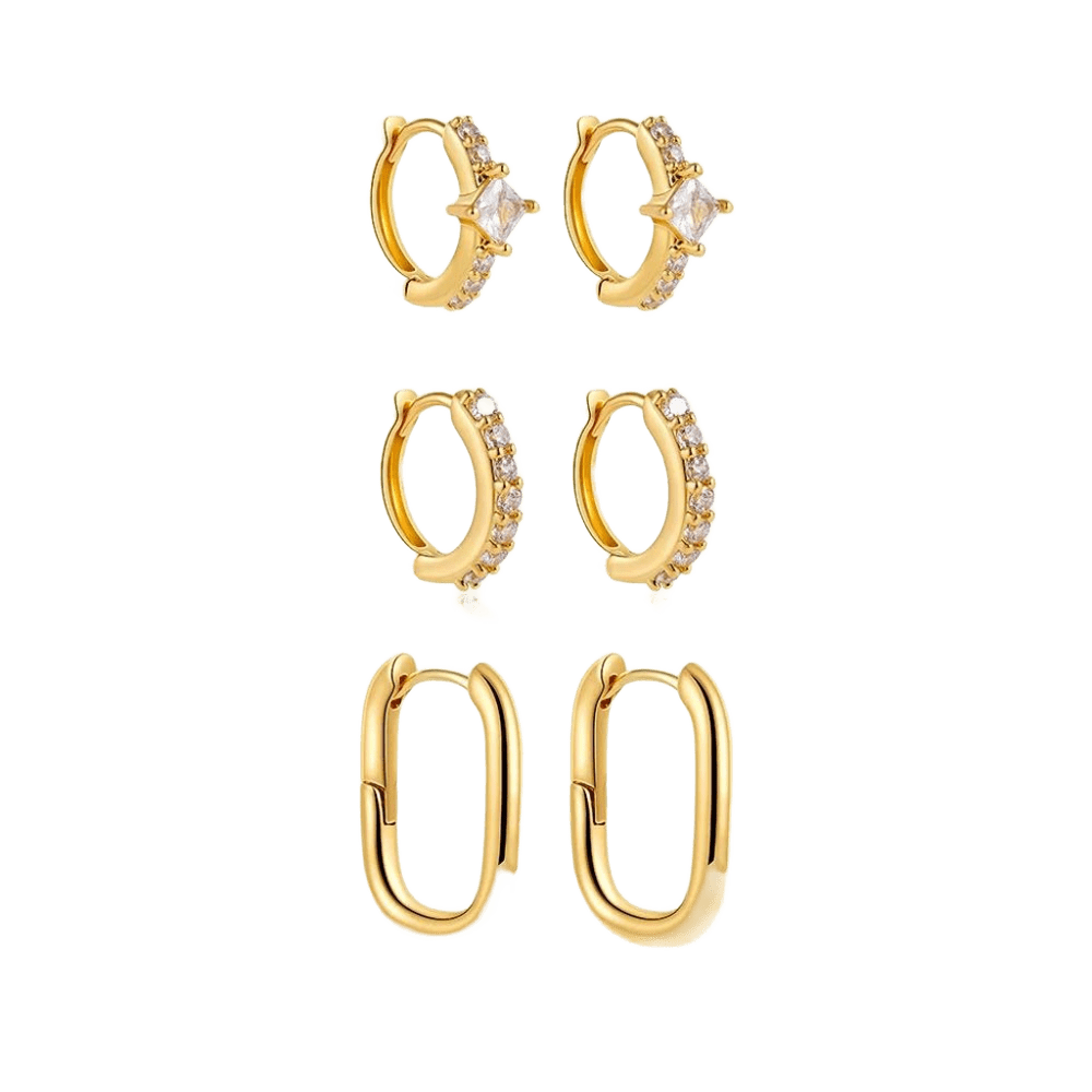 Shine with effortless elegance wearing this 18K gold plated hoop earring set. Featuring three unique hoop styles, this versatile collection is designed to complement any outfit — from casual chic to evening glam.