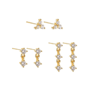 Shine with elegance every day with this 18K gold plated stud earring set, featuring 3 unique designs in one collection. From minimalist single studs to chic double and triple drop styles, each pair is adorned with sparkling cubic zirconia stones that add just the right touch of glamour. Lightweight and versatile, they are perfect for layering or wearing solo.